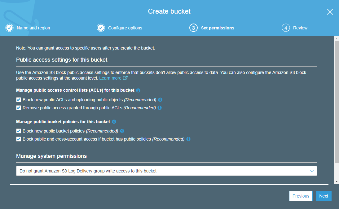 On the Set permissions page, you will be able to control the public access setting for the bucket. By default the bucket and the objects within it are not publicly accessible. Keep the default settings and choose Next.