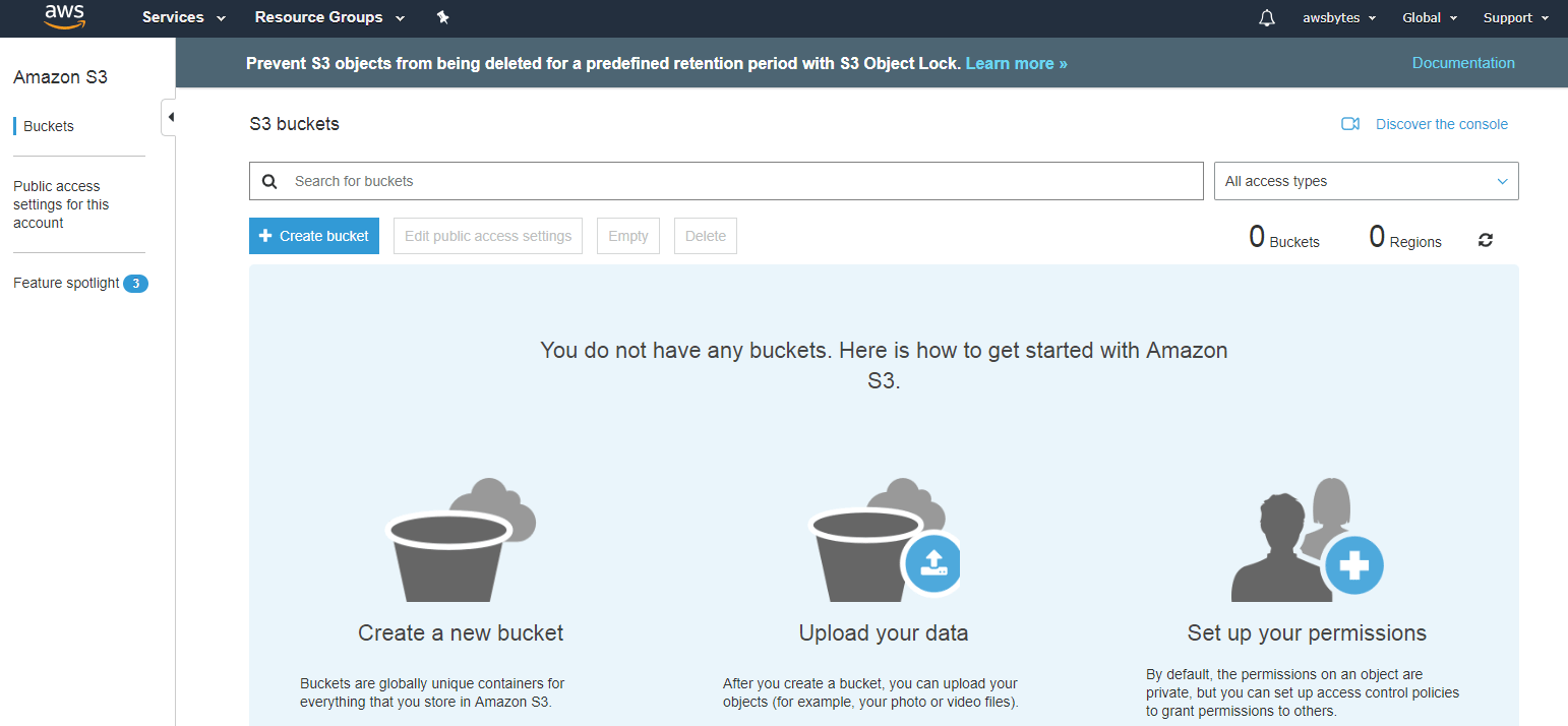 If you are accessing S3 for the first time, you will see the getting started page as shown in below image. Choose +Create bucket to create a new bucket.