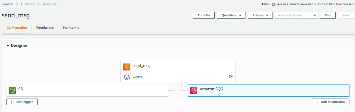 In this post I’ll show you how to send a message to an SQS queue when a new file is uploaded to an S3 bucket. I have an S3 bucket named ‘awsbytes’ and an SQS queue named ‘test’. I will create a lambda function to send the message.