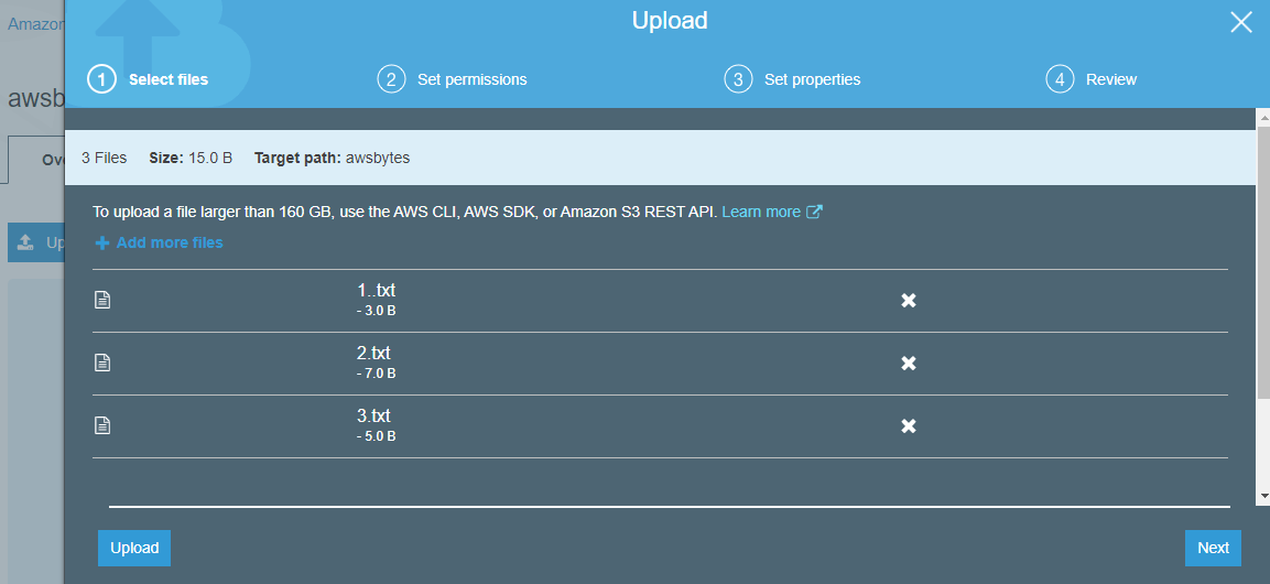 To test the lambda function, I’ve uploaded 3 files to the awsbytes S3 bucket.